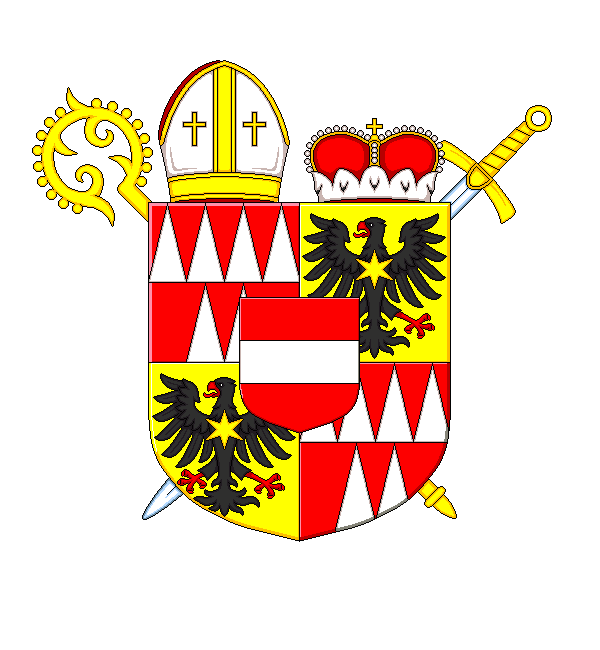 Popis erbu výše: Štít je čtvrcen s červeným srdečním štítem se stříbrným břevnem. V 1. a 4. červeném poli je 6 (4 nahoře a 2 dole) stříbrných kuželů. Ve 2. a 3. zlatém poli je černá orlice s červenou zbrojí a se zlatou hvězdou na prsou. Na štítu je vpravo mitra a vlevo knížecí koruna. Za štítem jsou zkříženy kosmo berla a šikmo meč.