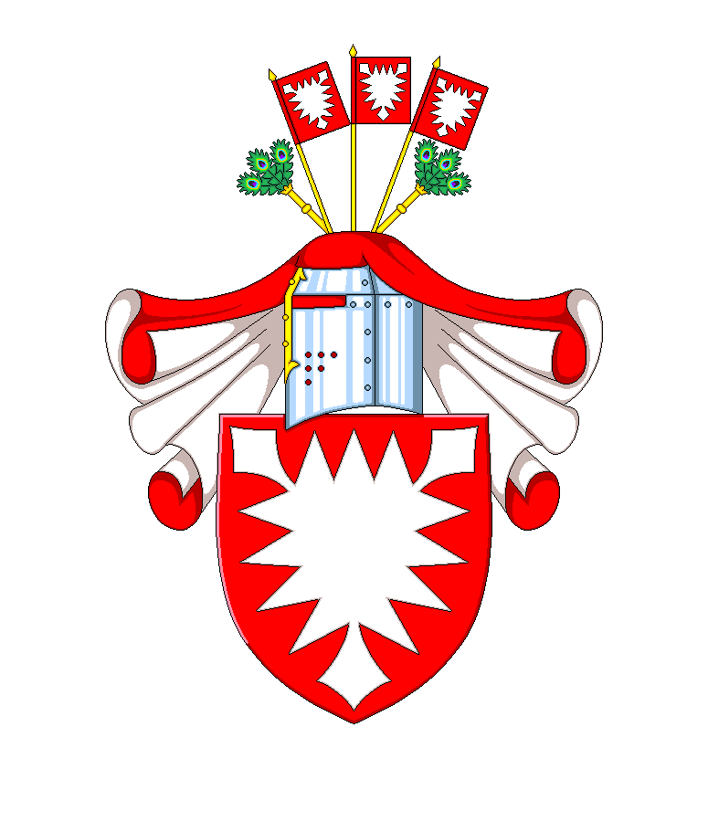 Znak Jana IX. ze Středy: V červeném štítu je 6 (4,2) stříbrných kuželů.