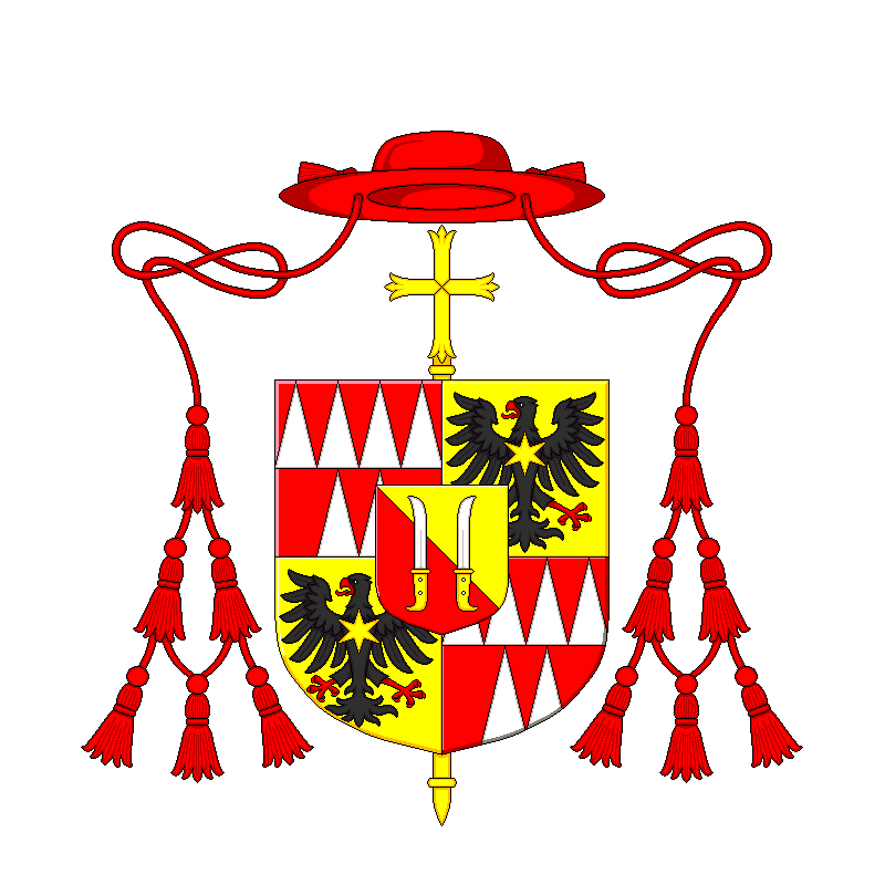 Popis erbu výše: Štít je čtvrcen se zlato-červeně kosmo děleným srdečním štítem, v němž jsou postaveny 2 odvrácené stříbrné vinařské nože se zlatými střenkami. V 1. a 4. červeném poli je 6 (4,2) stříbrných kuželů. Ve 2. a 3. zlatém poli je černá orlice s červenou zbrojí a se zlatou hvězdou na prsou. Za štítem je postaven procesní kříž. Vše je převýšeno červeným kardinálským kloboukem se 6 (1,2,3) střapci po stranách.