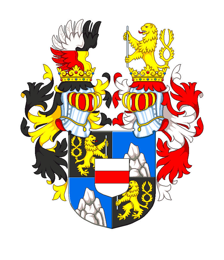 Popis erbu výše: Štít je černo-modře čtvrcen se stříbrným srdečním štítem, v němž je červené břevno. V 1. a 4. poli je zlatý dvouocasý lev směřující do středu štítu a držící v tlapách ocelovou tyč. Ve 2. a 3. poli strmá skála přirozených barev. Na štítu jsou 2 turnajské přilby s přikrývadly vpravo černo-zlatými a vlevo červeno-stříbrnými. Pravým klenotem jsou zavřená dělená křídla, přední stříbrno-červeně a zadní černo-zlatě. Levým klenotem je rostoucí zlatý dvouocasý lev, držící ocelovou tyč
