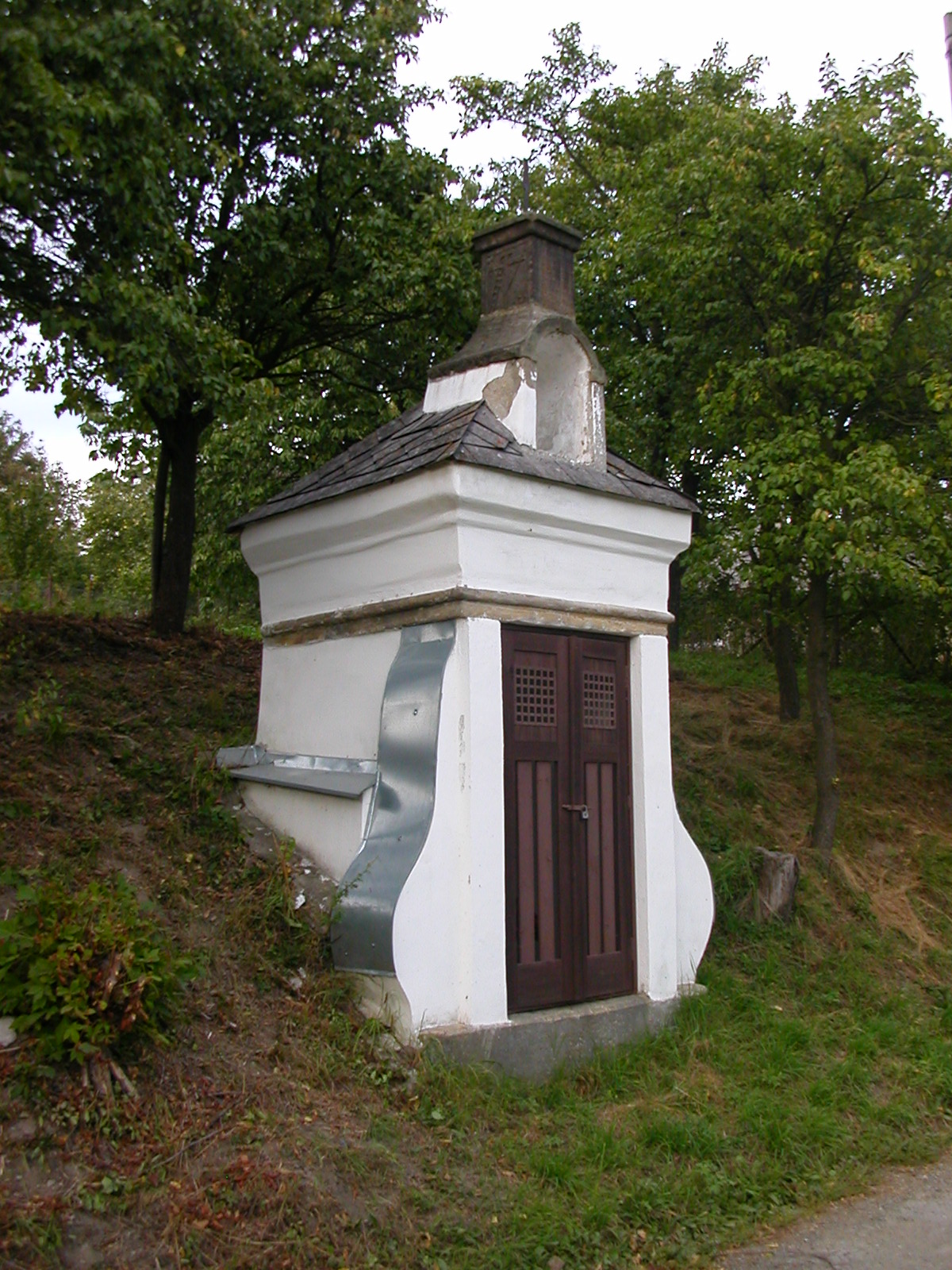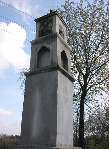 Dodnes stojící Boží muka na cestě mezi Ráječkem a Skaličkou s polepšeným erbem Martina Půhončího z Předmostí